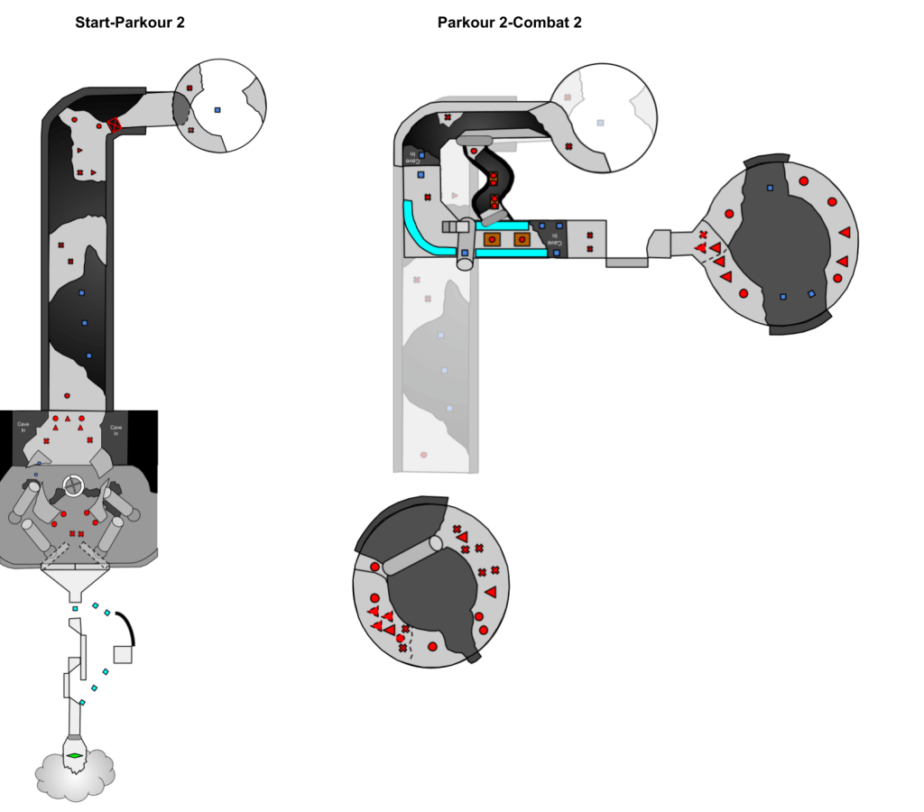 In Combat 2, I aimed to replicate the tower structure with broken stairs seen in Parkour 2. Enemies were strategically positioned throughout the tower, considering the challenging parkour elements. Ranged enemies were placed on the far side of platforms, allowing players to focus on grapple-to-wall run combinations without being targeted. To allow player agency, I introduced two doorways: one leading to the lower section of Parkour 3 and the other to the upper section, creating alternate pathways.