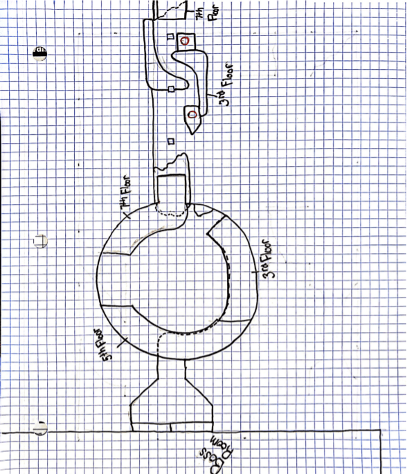 - Boss Marker & Grapple Points – The boss fight became engaging, encouraging players to utilize the entire area. However, there were issues with locating the boss and transitioning between upper and lower sections. To address this, I introduced a camera-facing sprite as a marker on the boss at the fight’s start. Additionally, I placed grapple points in the four walkway gaps, enabling faster and more flexible movement between sections.