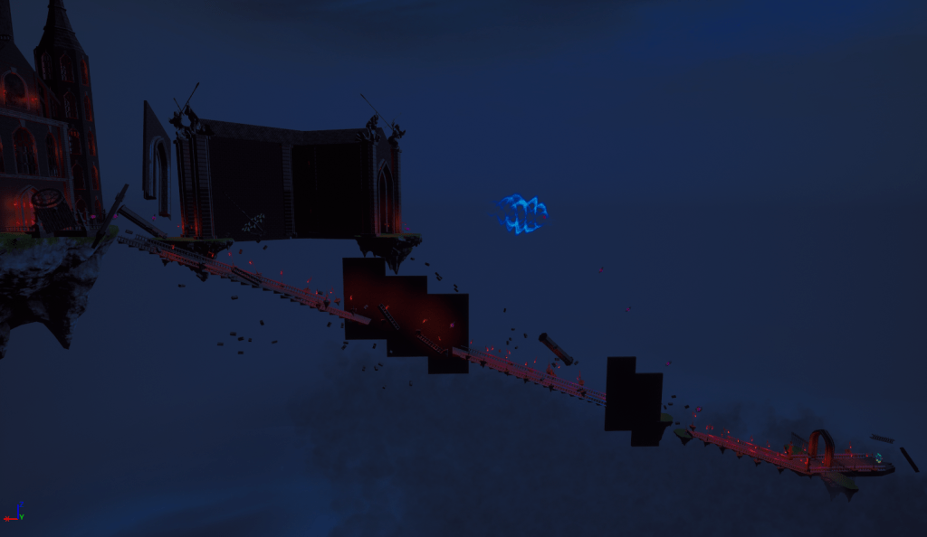 The level starts with the player spawning in front of a portal where the player can see a broken staircase leading them to the entrance of this large Gothic Palace where the Milkomancer resides. Behind the portal is what looks like a broken bridge/walkway that has floating railings and debris around it.